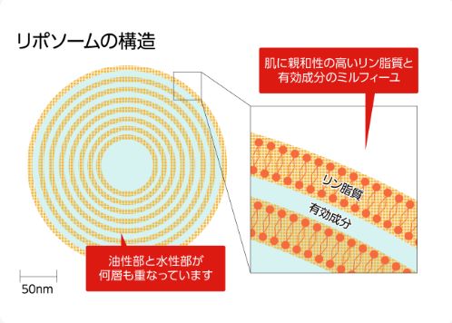 リポソームはもともと医療現場で使われていて、薬の成分を必要な場所へ必要な時に届けるために開発されたカプセルです。拡大すると玉ねぎのように多重層になっていて、ゆっくりじっくり有効成分を浸透させられるというのが特徴です。