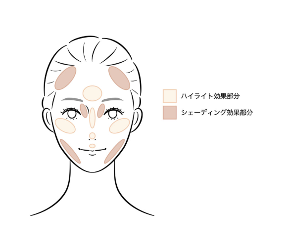 ・額・鼻筋・目の下・あご先などにつかえば、自然なハイライト効果が得られる。