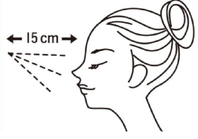 顔から15㎝くらい離して、目・口を閉じて顔全体にムラなくスプレーします。