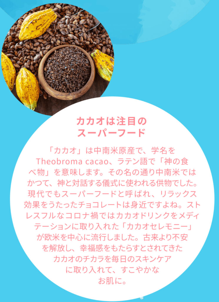 カカオが長い間、心の安定や幸福感を高める効果があるとされてきたので、その力を毎日のスキンケアに取り入れてみてはいかがでしょうか。カカオの力で、自然にお肌を健やかに保つことができるんですよ。
