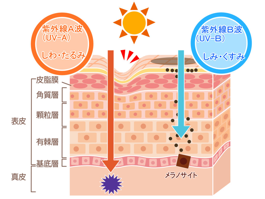 UV₋Aは肌の真皮まで侵入して、ハリや弾力に関わっている細胞を破壊してしまう恐れがあります。