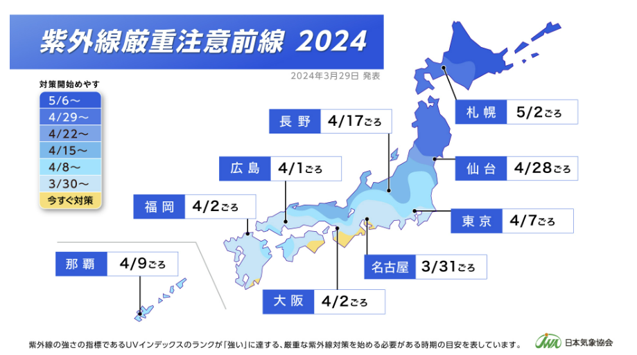 日本気象協会が発表した「紫外線厳重注意前線2024」によると、西日本と東日本の広い範囲で4月上旬から紫外線注意が必要になりそうです。
