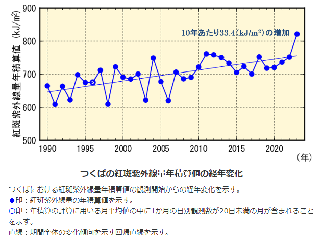 日本の紫外線量は年々増え続けています。気象庁は1990年代初めに国内3か所(札幌、つくば、那覇)で紫外線量を観測していますが、1990年の観測開始以来、札幌とつくばでは増加し続けています。つくばでは10年間で4.3%増加していると報告されています。